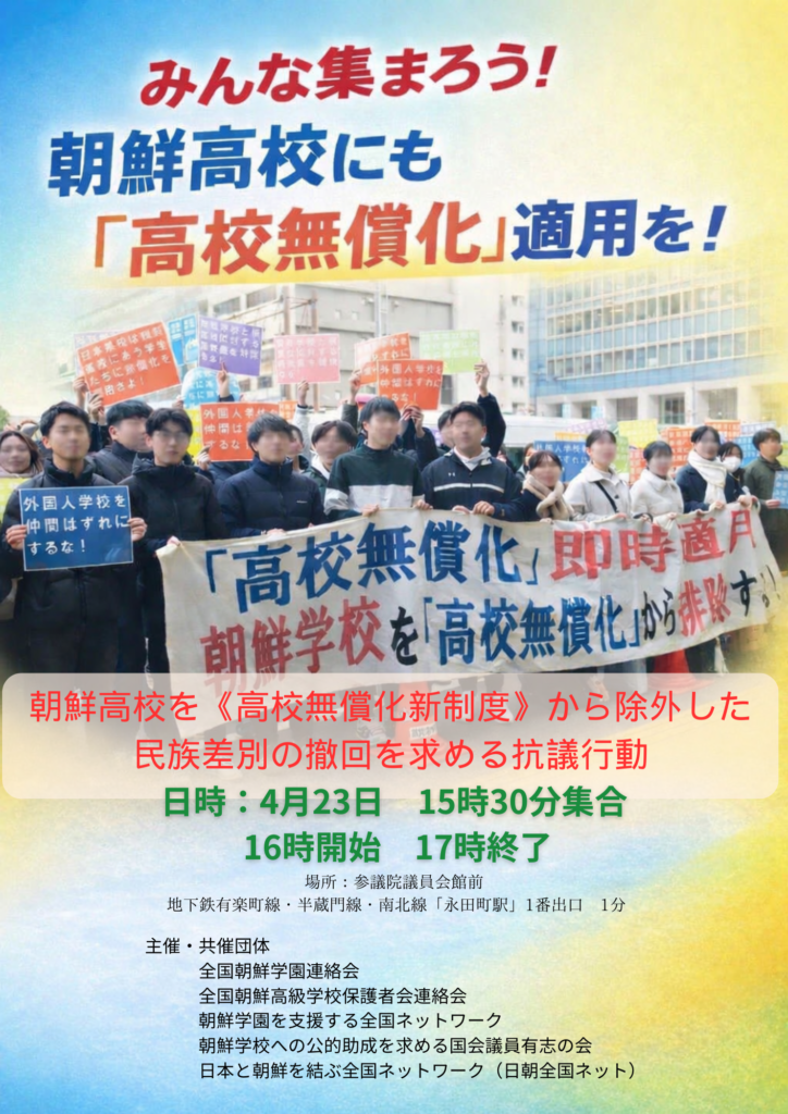 ■内容=高校の授業料無償化を拡充する改正法が可決されたが、朝鮮学校は対象外に置かれ続けている。日本政府に民族差別撤回を求め抗議糾弾する。