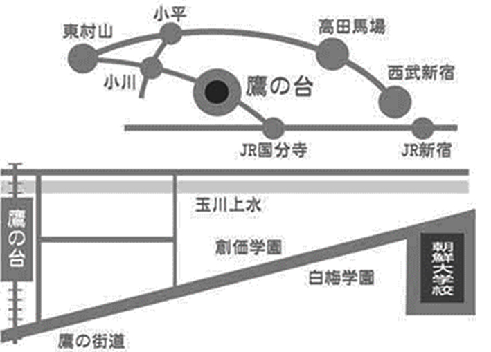JR中央線「国分寺」駅より西武バスで20分(寺71系 朝鮮大学校前で下車1分)西武国分寺線「鷹の台」駅から徒歩15分